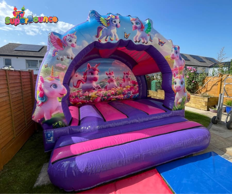 Our Brand New Unicorn 12x12 Bouncy Castle measures a spacious 12ft in length and 12ft in width, providing plenty of room for bouncy fun. It comes equipped with safety mats and a built-in rain cover, ensuring playtime is both safe and uninterrupted by sudden weather changes. 🌧️