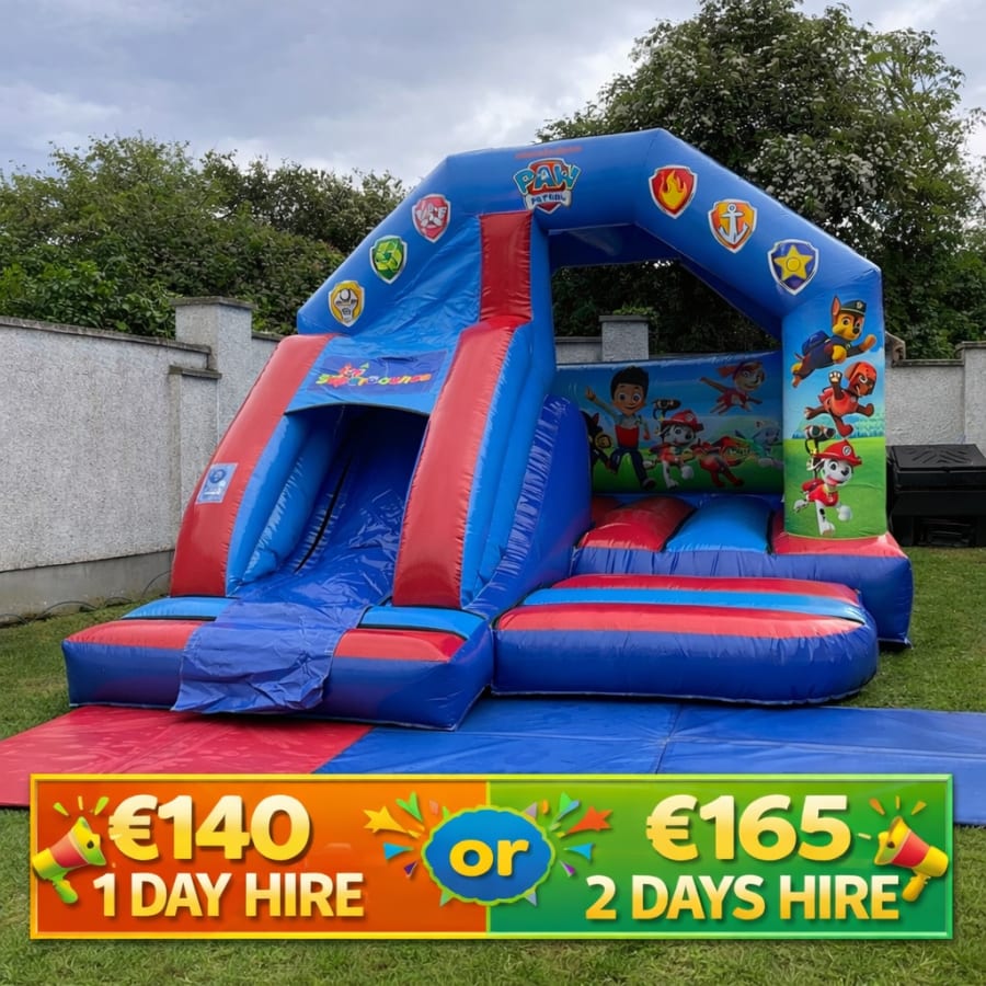 Let the Paw Patrol team bring excitement to your next event! This colourful 15ft x 12ft inflatable features your favourite characters and a fun front slide — perfect for birthdays, school fun days, communions, and family gatherings. πŸŽ‰
