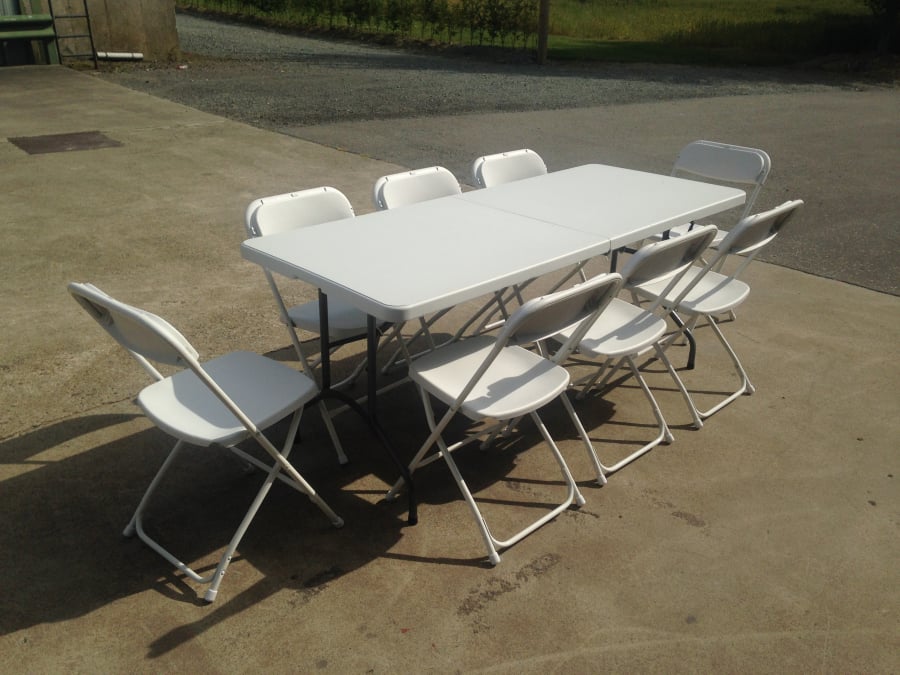 Fits 3 chairs each side and one each end comfortably seating 8 People.